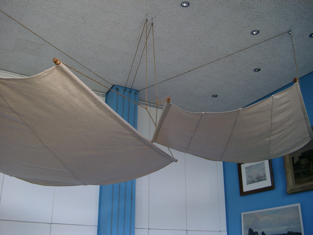Het onderstel lijkt op een schip in aanbouw met kielbalk en spanten. Het linker vlak van donker hout is afgewerkt met scheepslak. Eén kant heeft een reling om te voorkomen dat mensen overboord gaan. Boven de tafel zijn zeilen gehangen.
